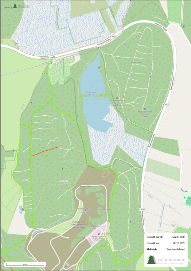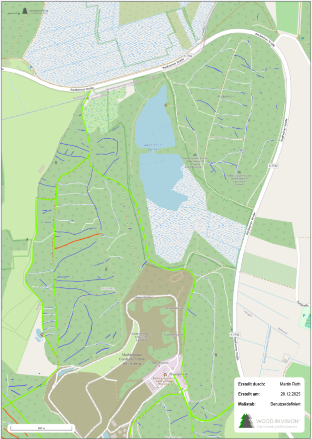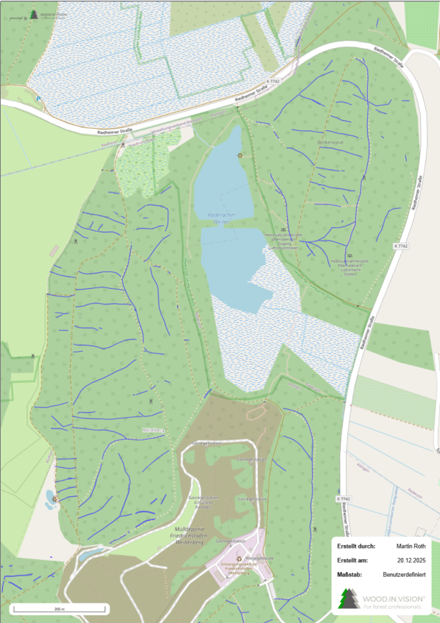 Seit etwa einem Jahr habe ich innerhalb von Wood-In-Vision ein digitales Geländemodell zur Verfügung und erfasse in ihm meine erkennbaren Fahrspuren. Diese überprüfe und ergänze ich bei Bedarf im Gelände mit Hilfe meiner integrierten RTK-Antenne und erstelle dann einen passenden Arbeitsauftrag. Die Erfassung am Bildschirm ist eine ziemliche Fleißarbeit. Vor ein paar Tagen hat mir die Firma Fröhlich+Gießing angeboten, diese Vorarbeit mit der für den Kanton Aargau entwickelten KI zu machen. Ich habe den Entwurf über/unter meine erfassten Gassen gelegt und war beeindruckt. Wenn ich berücksichtige, dass die Datengrundlage eine Befliegung von 2020 war und manche Gasse von mir oder dem Harvester getrackt war, wird das Ergebnis noch deutlicher. Und Herr Gießing meinte, dass sich das noch optimieren lässt. Die Kosten dafür liegen zwischen 0,7 und 3,0 € je nach Flächengröße