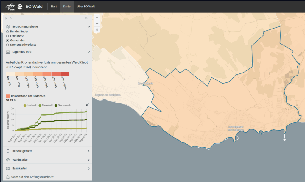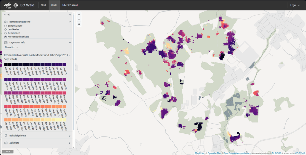 Auf der Webseite der DLR kann man die Waldverluste von 2017-2024 sichtbar machen. In meinem Revier erlebe ich das als ein hilfreiches Tool, das Ausmaß dieser Entwicklung den Waldeigentümern und der Bevölkerung verständlich zu machen.